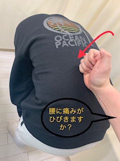 3.背中をグーで軽くたたくと腰に痛みが響くか確認する。